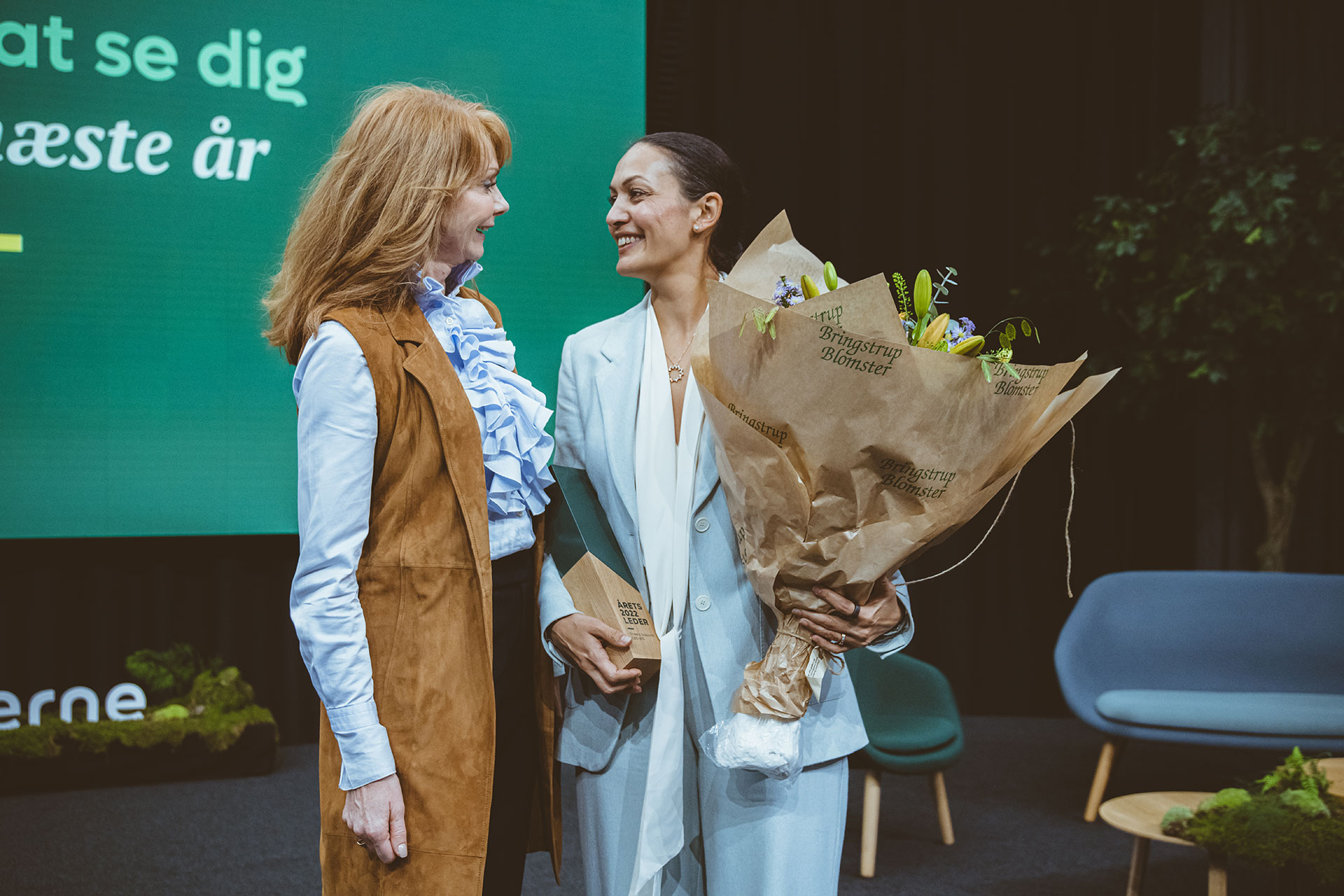 CEO og Partner i BIG, Sheela Maini Søgaard, var både meget rørt og meget glad, da hun i dag fik overrakt prisen som Årets Leder 2022 af Ledernes direktør, Bodil Nordestaard Ismiris.